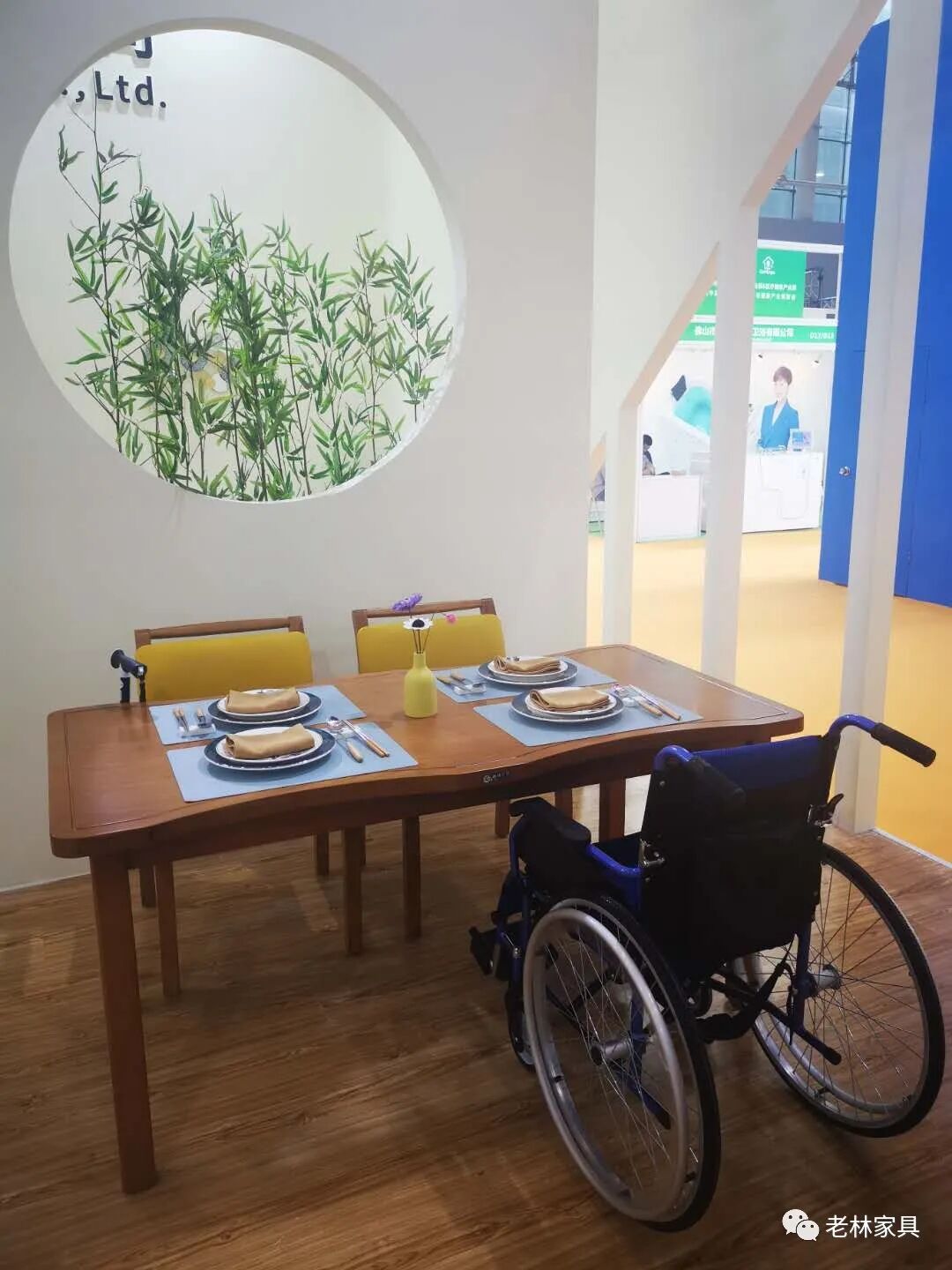 3、 弧形桌、T型桌、梅花桌等设计符合轮椅老人的生活习惯,美观的外形设计,精致的做工,环保的材料,无不体现老林公司对适老家具的深刻理解和对长者贴心的关怀。